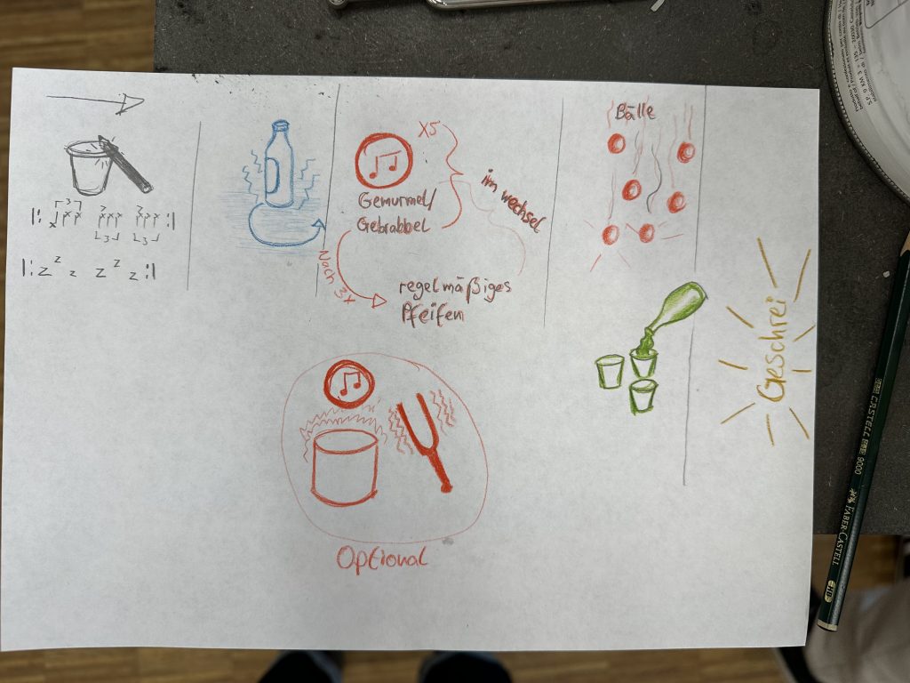 Unsere Gruppe entschied sich für einen Dialog – bzw. „Trialog“ – zwischen einem musikalischen Duett und einer bildhaft-bewegten Partitur.