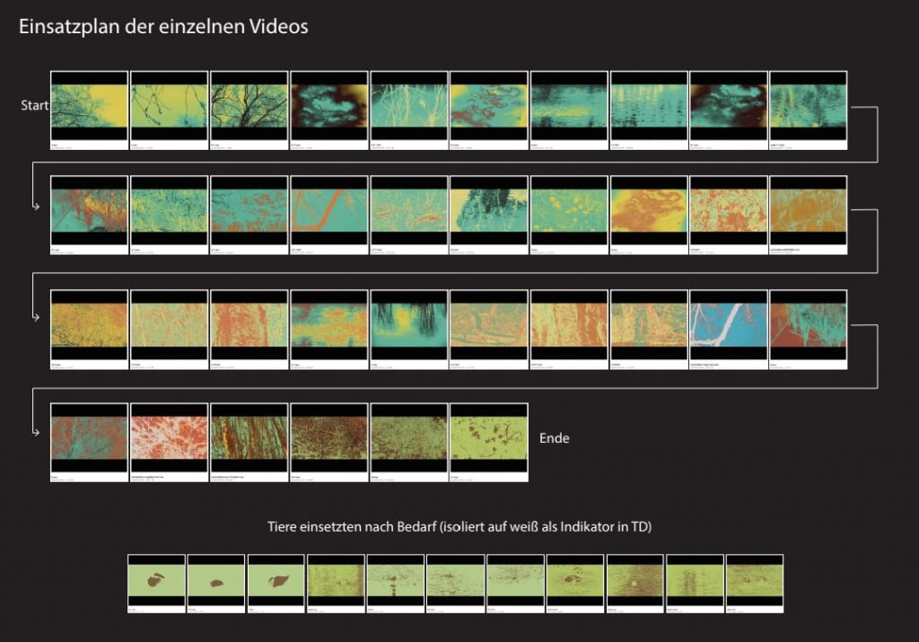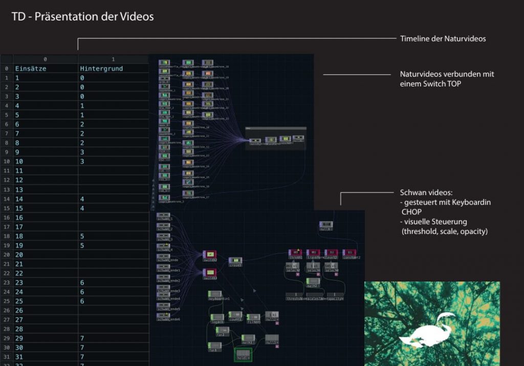 Die Partitur erstellten wir auf Grundlage eigener Videoaufnahmen, die Julien und ich im Raum Werden anfertigten. Für dieses Videomaterial konzentrierten wir uns auf Bewegung in der Natur, die aus sich, bzw. den natürlichen Umständen, heraus besteht. Es kristallisierte sich die Bewegung von Vögeln als zentrales Motiv.