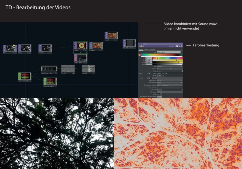 Das gesammelte Material wurde von Sophie und Paul (beide FB 4) in Touchdesigner weiter verarbeitet, wir analysierten die gefilmten Strukturen, interpretierten ihre emotionale Wirkung und erstellten darauf aufbauen Konzepte für die „Entfremdung“ unseres Materials, aus dem anschließend eine bewegte Partitur zusammengeflechtet wurde.